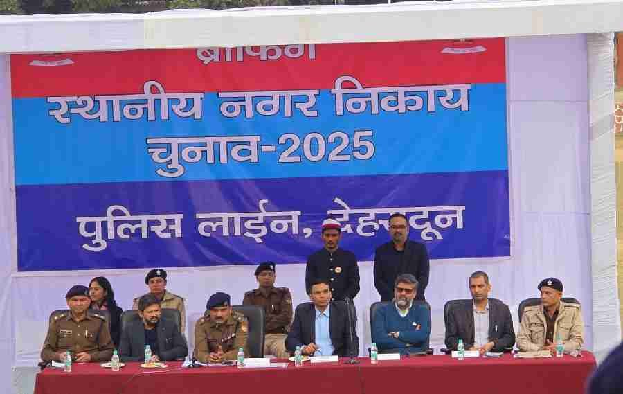 नगर निकाय चुनाव के दौरान दिनांक 23/01/2025 को होने वाली मतदान प्रक्रिया को सकुशल सम्पन्न कराने हेतु आज दिनांक 21/01/2025 को पुलिस लाइन देहरादून में जिलाधिकारी देहरादून तथा वरिष्ठ पुलिस अधीक्षक देहरादून द्वारा चुनाव ड्यूटी में लगे समस्त पुलिस बल एवं प्रशासनिक अधिकारियों की ब्रींफिंग की गई।
