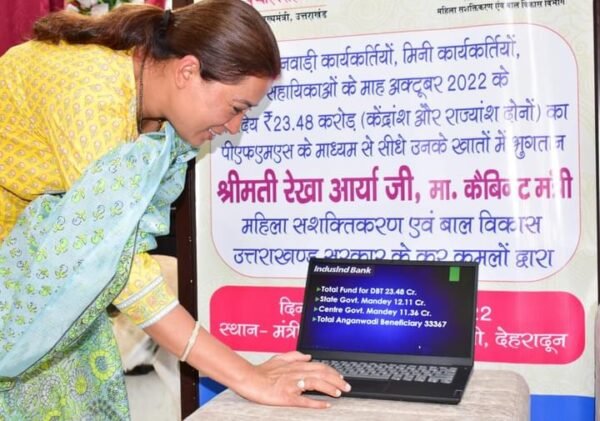 दीपावली पर कैबिनेट मंत्री रेखा आर्या ने आंगनबाड़ी बहनों को बड़ा तोहफा दिया है। जहाँ आज यमुना कॉलोनी स्थित शासकीय आवास पर महिला सशक्तिकरण एवं बाल विकास मंत्री रेखा आर्या ने आंगनबाड़ी कार्यकर्तियों के अक्टूबर माह के मानदेय 23.48 करोड़ (केन्द्रांश और राज्यांश दोनों)का पीएफएमएस के माध्यम से सीधे उनके खातों में भुगतान किया।कैबिनेट मंत्री ने कहा कि इससे प्रदेश में कार्यरत करीब 35 हजार आंगनबाड़ी कार्यकर्तियों लाभान्वित होंगी।