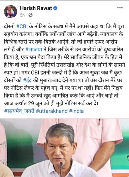 2016 का स्टिंग ऑपरेशन मामला, पूर्व मुख्यमंत्री हरीश रावत के देहरादून निवास पहुंची सीबीआई, हरीश रावत को नोटिस देने के लिए पहुंची थी सीबीआई की टीम, उस समय हरीश रावत अपने निवास पर मौजूद नही थे। इस पर अब पूर्व मुख्यमंत्री हरीश रावत का बयान सामने आया है। हरीश रावत ने कहा कि सीबीआई का स्वागत है। जांच एजेंसी का सहयोग करने के लिए हर तरीके से तैयार हूं। CBI के नोटिस के संबंध में मैंने आपसे कहा था कि मैं पूरा सहयोग करूंगा! क्योंकि ज्यों-ज्यों जांच आगे बढ़ेगी, न्यायालय के विभिन्न स्तरों पर तर्क-वितर्क आएंगे, तो जो हमारे ऊपर आरोप लगे हैं और #भाजपा ने जिस तरीके से उन आरोपों को दुष्प्रचारित किया है, एक भ्रम पैदा किया है। मेरे सार्वजनिक जीवन के हित में है कि वो बातें, पूरी स्थितियां उत्तराखंड और देश के लोगों के सामने स्पष्ट हों।