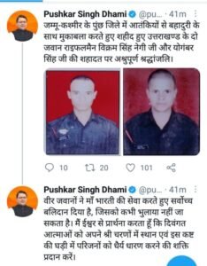 मुख्यमंत्री पुष्कर सिंह धामी ने जम्मू-कश्मीर के पुंछ जिले में आतंकी मुठभेड़ के दौरान उत्तराखंड के दो जवानों के शहीद होने पर गहरा शोक व्यक्त किया है। मुख्यमंत्री ने कहा कि राइफलमैन विक्रम सिंह नेगी और योगंबर सिंह ने देश सेवा के लिए अपने प्राणों का सर्वोच्च बलिदान दिया है। जिसको कभी भुलाया नहीं जा सकता है। मुख्यमंत्री ने दोनों शहीद जवानों के परिजनों को इस दुःख की घड़ी में धैर्य रखने की कामना की है।