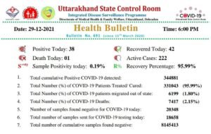 उत्तराखंड स्वास्थ्य विभाग की ओर से जारी की गई हेल्थ बुलेटिन के अनुसार उत्तरखंड में आज 38 लोग कोरोना संक्रमित मिले हैं। आज मिले संक्रमितों के बाद राज्य में कोरोना संक्रमित लोगो की संख्या 344881 हो गयी है। जबकि एक संक्रमित की मौत भी हुई है। उत्तराखंड में एक्टिव केस की संख्या 222 हैं जबकि 42 लोग स्वस्थ हुए हैं।