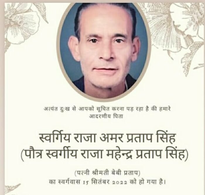 स्वर्गीय राजा महेंद्र प्रताप सिंह के पौत्र स्वर्गीय राजा अमर प्रताप सिंह का देहांत हो गया है जिस कारण समस्त परिवारजनों में शोक की लहर है। राष्ट्रीय जाट एकता मंच उत्तराखंड के समस्त पदाधिकारियों एवं कार्यकर्ताओं ने उनके निधन पर शोक प्रकट करते हुए अपनी श्रद्धांजलि अर्पित की। राष्ट्रीय जाट एकता मंच के प्रदेश अध्यक्ष चौधरी जगवीर सिंह ने कहा कि स्वर्गीय राजा अमर प्रताप सिंह बेहद ही सरल संभव,धार्मिक और बहुमुखी प्रतिभा के धनी थे उन्होंने अपना समस्त जीवन लोगों की भलाई में समर्पित किया उनकी प्रतिभावान कार्यशैली के सभी कायल रहे।
