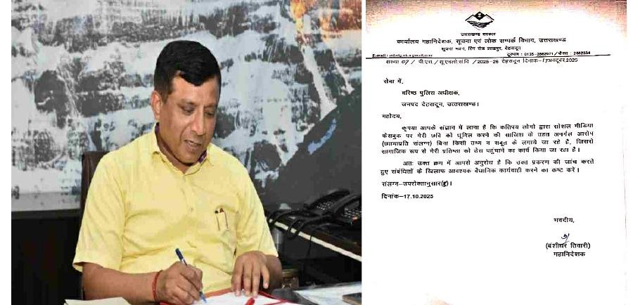 राज्य के महानिदेशक सूचना बंशीधर तिवारी ने सोशल मीडिया पर उनके खिलाफ चल रहे दुष्प्रचार और फेक पोस्ट्स के मामले में वरिष्ठ पुलिस अधीक्षक देहरादून अजय सिंह को पत्र लिखा है। उन्होंने अपनी छवि धूमिल करने की साजिश में शामिल व्यक्तियों के खिलाफ वैधानिक कार्रवाई की मांग की है।