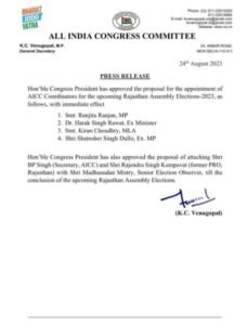 राजस्थान में होने वाले चुनाव में कोर्डिनेटर की दी गई जिम्मेदारी,