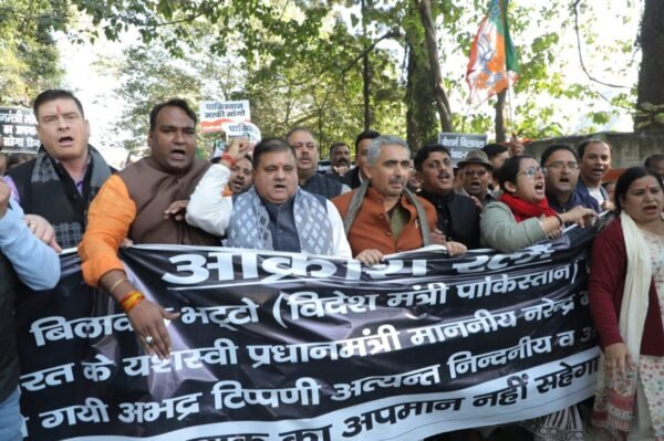 पाकिस्तानी विदेश मंत्री बिलावल भुट्टो जरदारी द्वारा भारत के यशस्वी प्रधानमंत्री नरेन्द्र मोदी को लेकर दिए गए तर्कहीन, घटिया व शर्मनाक बयान के विरोध में भाजपा प्रदेश अध्यक्ष महेन्द्र भट्ट के नेतृत्व में एवं महानगर अध्यक्ष सिद्धार्थ उमेश अग्रवाल की अध्यक्षता में भारतीय जनता पार्टी महानगर, देहरादून द्वारा आक्रोश रैली का आयोजन हुआ।रैली का समापन घण्टाघर पर बिलावल भुट्टो का पुतला दहन के साथ हुआ।प्रदेश अध्यक्ष महेन्द्र भट्ट ने उपस्थित जनसैलाब को संबोधित करते हुए कहा कि बिलावल भुट्टो का बयान माफ करने योग्य नही है, उन्हौंने कहा कि आज जिस प्रकार से देहरादून में यह आक्रोश रैली का आयोजन हुआ है मुझे विश्वास है कि इसकी गुंज पाकिस्तान में बैठे वहां के हुकमरानों को सुनाई पडे़गी। उन्हौंने यह भी कहा कि आज जबकि पुरा विश्व मोदी जी के न्तृत्व में चलना चाहता है ऐसी स्थिति में यह कायराना बयान अचम्भित करने वाला है।कार्यक्रम में कैबिनेट मंत्री प्रेमचंद अग्रवाल ने कहा कि पाकिस्तान के विदेश मंत्री की टिप्पणी बेहद निंदनीय और कायरतापूर्ण है। और यह बयान हास्यस्पद है। उन्हौंने कहा कि पाकिस्तान को इसके लिए माफी मांगनी होगी।