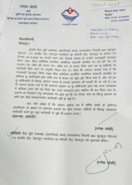 जिलाधिकारी देहरादून को पत्र लिख मामलें में प्राथमिकता के आधार पर जांच के दिए निर्देश।।