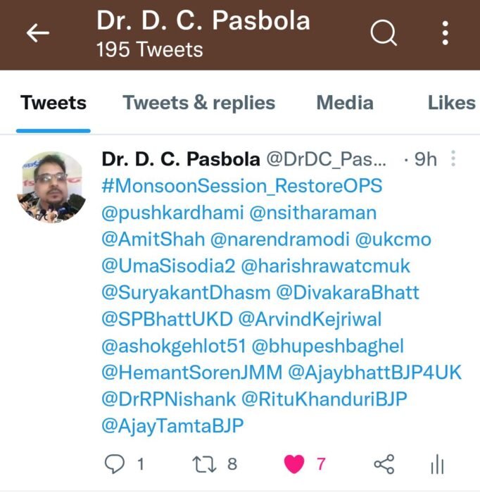 राष्ट्रीय पुरानी पेंशन बहाली संयुक्त मोर्चा के केंद्रीय नेतृत्व के आह्वान पर देशभर में 1 अगस्त 2022 को देशव्यापी मानसून सत्र ट्विटर महाअभियान रहा इसके तहत सभी कार्मिकों को #MonsoonSeassion_RestoreOPS अधिक से अधिक ट्वीट करने का आह्वान किया गया था तथा इसे फेसबुक और व्हाट्सएप व अन्य सोशल मीडिया प्लेटफॉर्म के माध्यम से शेयर करने की अपील भी की गई थी lउत्तराखंड में भी केंद्रीय नेतृत्व के आह्वान पर राज्य भर के कर्मचारियों ने ट्विटर पर इस अभियान में हिस्सा लिया और #MonsoonSeisson_RestoreOPS को ट्वीट किया , यह ट्विटर पर दिनभर टॉप ट्रेंड करते रहा l