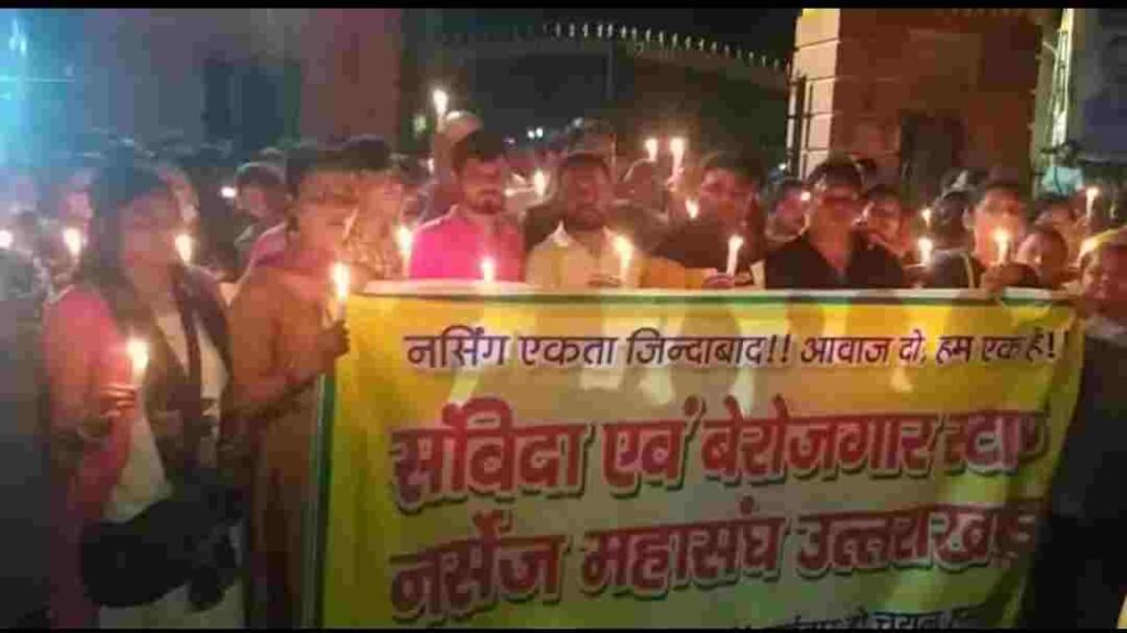 नर्सिंग भर्ती शुरू किए जाने की मांग को लेकर उत्तराखंड संविदा व बेरोजगार संघ से जुड़े नर्सिंग बेरोजगारों और संविदा कर्मचारियों ने देर रात कैंडल मार्च निकाला। एकता विहार स्थित धरना स्थल पर आंदोलनरत नर्सिंग बेरोजगार रविवार शाम परेड ग्राउंड में एकत्रित हुए उसके बाद कैंडल मार्च निकालते हुए सरकार से नर्सिंग भर्ती शुरू किए जाने की मांग की। महासंघ के अध्यक्ष हरि कृष्ण का कहना है कि सभी बेरोजगार विगत 27 जुलाई से एकता विहार में अनिश्चितकालीन धरने पर बैठे हुए है, लेकिन सरकार उनकी मांगों को अनसुना कर रही है। उन्होंने कहा कि नर्सिंग की भर्ती विगत कई वर्षों से नहीं हो पा रही है, ऐसे में वह तब तक धरने से नहीं उठेंगे जब तक इसका शासनादेश जारी नहीं हो जाता है। उन्होंने कहा कि शासनादेश जारी ना होने तक उनका आंदोलन जारी रहेगा।