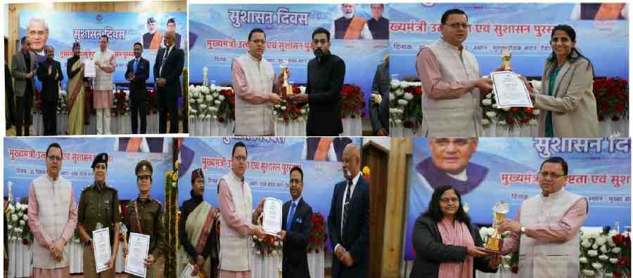 मुख्यमंत्री पुष्कर सिंह धामी ने सुशासन दिवस के अवसर पर मुख्यमंत्री आवास स्थित मुख्य सेवक सदन में सराहनीय कार्य करने वाले अधिकारियों एवं कर्मचारियों को मुख्यमंत्री उत्कृष्टता एवं सुशासन पुरस्कार से सम्मानित किया। उन्होंने पुरस्कार प्राप्त करने वाले सभी अधिकारियों एवं कर्मचारियों को शुभकामनाएं दी। मुख्यमंत्री ने आशा व्यक्त की कि सभी अधिकारी एवं कर्मचारी आगे भी इसी मनोयोग से कार्य करते रहेंगे।