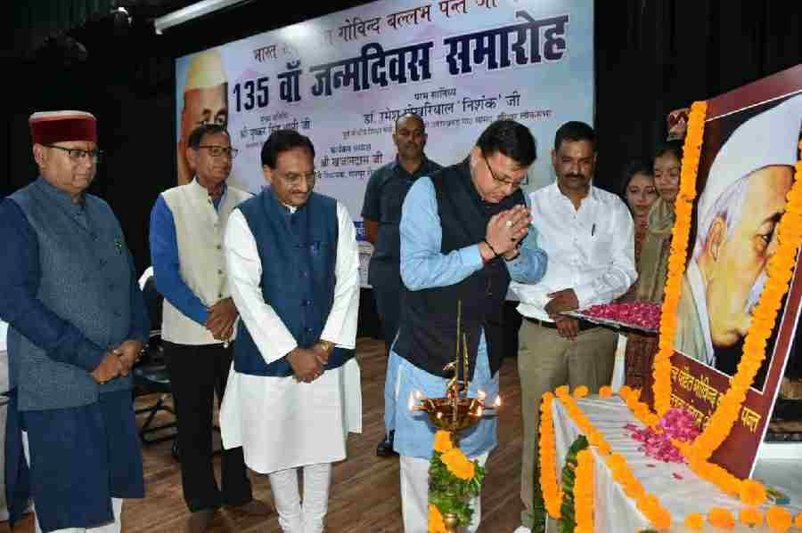 मुख्यमंत्री पुष्कर सिंह धामी ने सर्वे चौक स्थित आई.आर.डी.टी. सभागार में भारत रत्न पं. गोविन्द बल्लभ पंत जी के 135 वें जन्मदिन समारोह कार्यक्रम में प्रतिभाग किया। इस अवसर पर उन्होंने पं. गोविन्द बल्लभ पंत जी के चित्र पर श्रद्धासुमन अर्पित कर उन्हें श्रद्धांजलि दी।