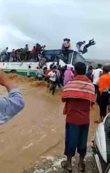 तस्वीरों में भयावह मंजर साफ़ दिख रहा है, जहाँ नदी का रपटा पार करते हुए बरसाती नदी के पानी में एक बस फंस गई और इसमें बैठे यात्रियों में हाहाकार मच गया। यात्री खिड़की से बाहर निकल छत पर चढ़ गए और छत पर चढ़े यात्री बस से नीचे कूद कूद कर अपनी जान बचाने को मजबूर थे, अब इसे प्रशासन की लापरवाही कहे या बस चालक की लापरवाही लेकिन बस में बैठे लोगों की ज़िंदगी ख़तरे में पड़ गई।